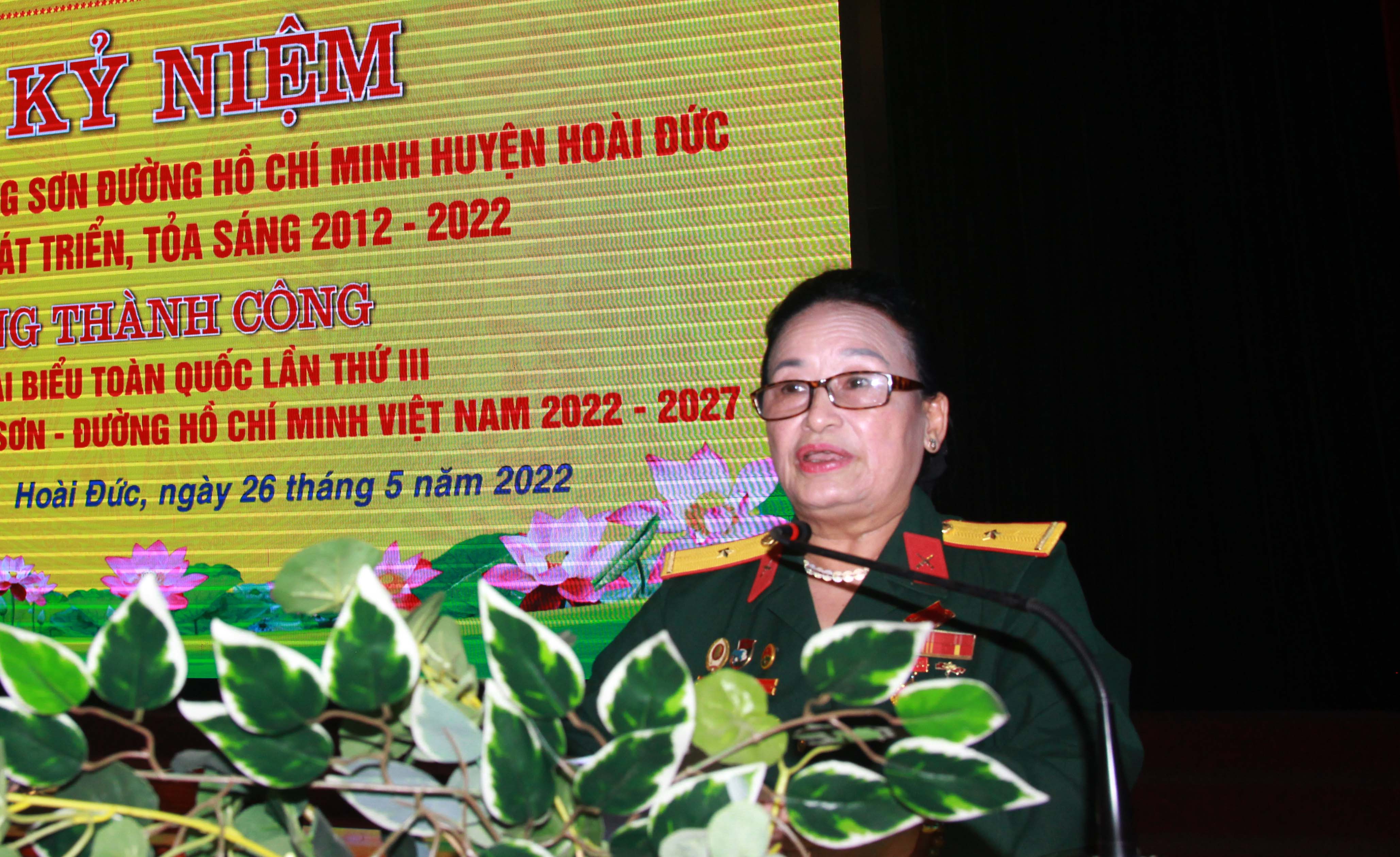 Đồng chí Ngô Thị Tuyết – Chủ tịch Hội Trường Sơn huyện Hoài Đức, thay mặt Thường trực Hội, khai mạc và đọc báo cáo Tổng kết 10 năm Hội Bộ đội Trường Sơn huyện Hoài Đức xây dựng, phát triển và tỏa sáng ( 2012-2022)