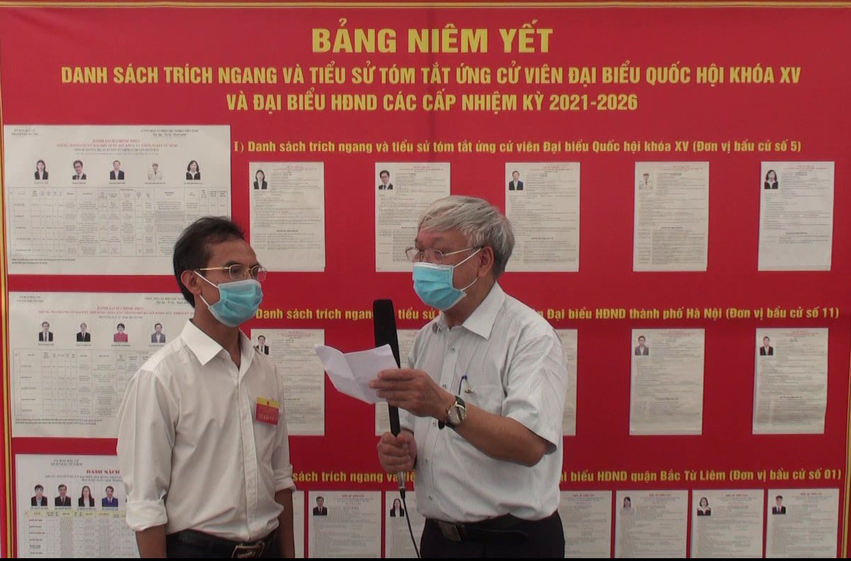 Đồng chí Nguyễn Quốc Huy - Trưởng Ban tuyên truyền Hội TSHN phỏng vấn Ông Nguyễn Duy Việt - Tổ trưởng Tổ bầu cử số 8 phường Xuân Tảo quận Bắc Từ Liêm thành phố Hà Nội về công tác tổ chức bầu cử ngày 23/5/2021.