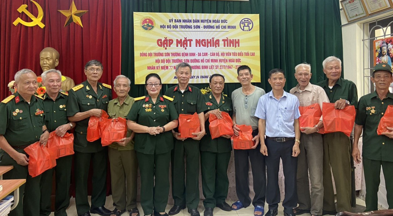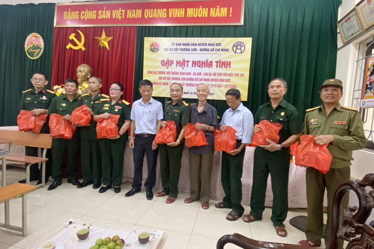 Nhân kỉ niệm 77 năm Ngày Thương binh-Liệt sỹ, BCH Hội Trường Sơn huyện Hoài Đức, đã trao tặng và tặng 42 suất quà của Hội Trường Sơn Viêt Nam và Hội Trưởng Sơn Hà Nội, cùng 30 suất quà của Hội Trường Sơn huyện Hoài Đức, tặng các đồng đội Thương bệnh binh, nạn nhân chất đốc da cam và cán bộ, hôi viên tuổi cao tiêu biểu trong hoạt động hội.
