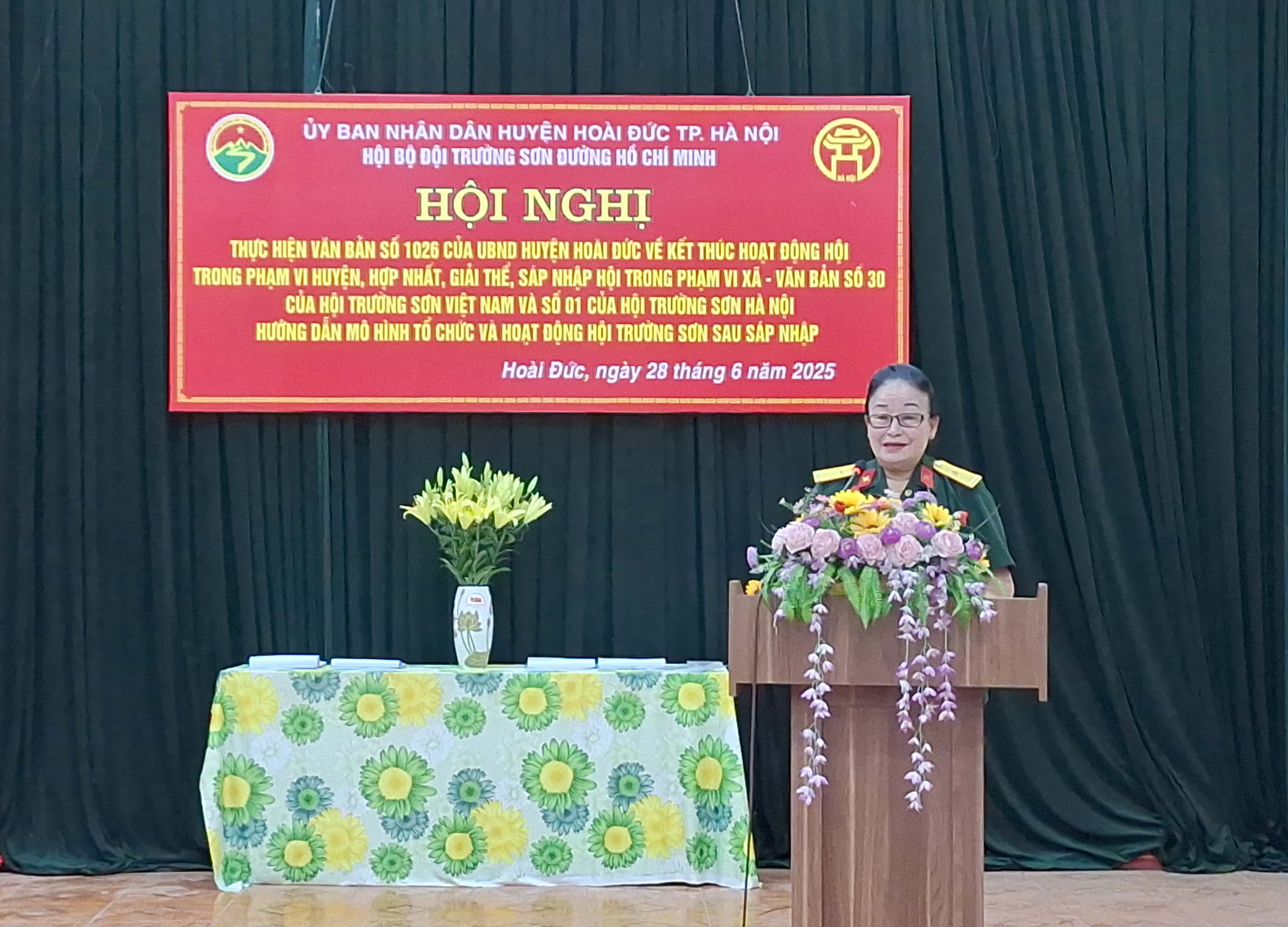 Đồng chí Ngô Thị Tuyết - Chủ tịch Hội TS Hoài Đức thay mặt BCH phát biểu khai mạc hội nghị. Triển khai thực hiện văn bản 1026 của UBND huyện Hoài Đức về kết thúc hoạt động Hội và văn bản số 30 của hội TSVN, văn bản số 01 của hội TSHN về mô hình tổ chức hoạt động hội Trường Sơn sau sáp nhập. (Ban biên tập sẽ đăng tải toàn văn các báo cáo của BCH tại hội nghị).