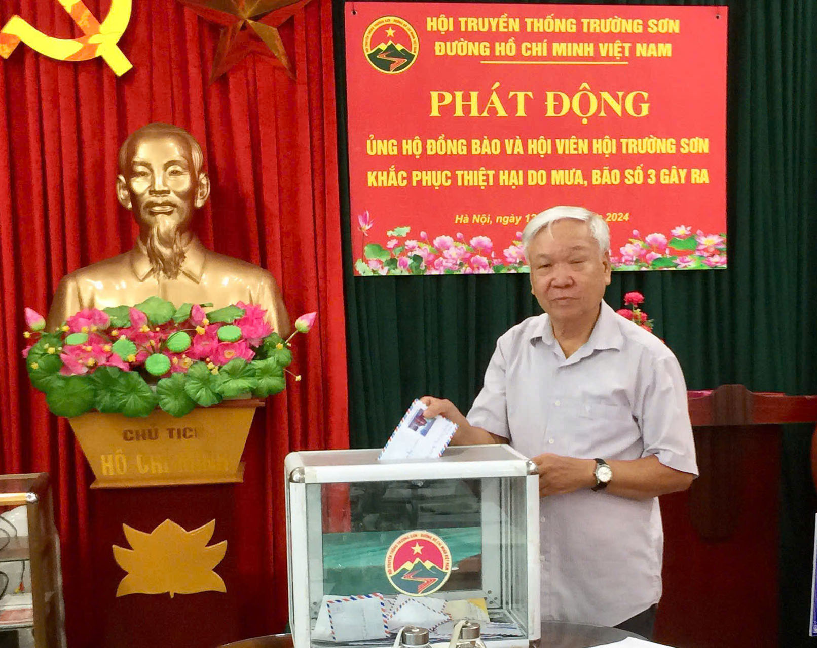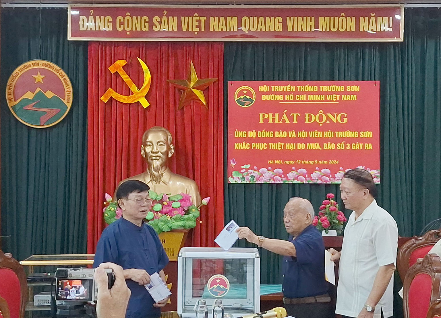 Hưởng ứng "Lời kêu gọi của Đoàn chủ tịch Uỷ ban trung ương MTTQ Việt Nam ngày 10/9/2024 về vận động ủng hộ đồng bào khắc phục thiệt hại do cơn Bão số 3 gây ra"; Sáng nay 12/9/2024, tại trụ sở Hội TSVN (quận Nam Từ Liêm Hà Nội). Thường trực Hội TSVN tổ chức phát động, vận động cán bộ, hội viên Trường Sơn và các doanh nhân, doanh nghiệp, nhà hảo tâm ủng hộ kinh phí, vật chất chung tay giúp đỡ nhân dân bị thiệt hại nặng nề do bão số 3 và lũ lụt sau bão gây ra.