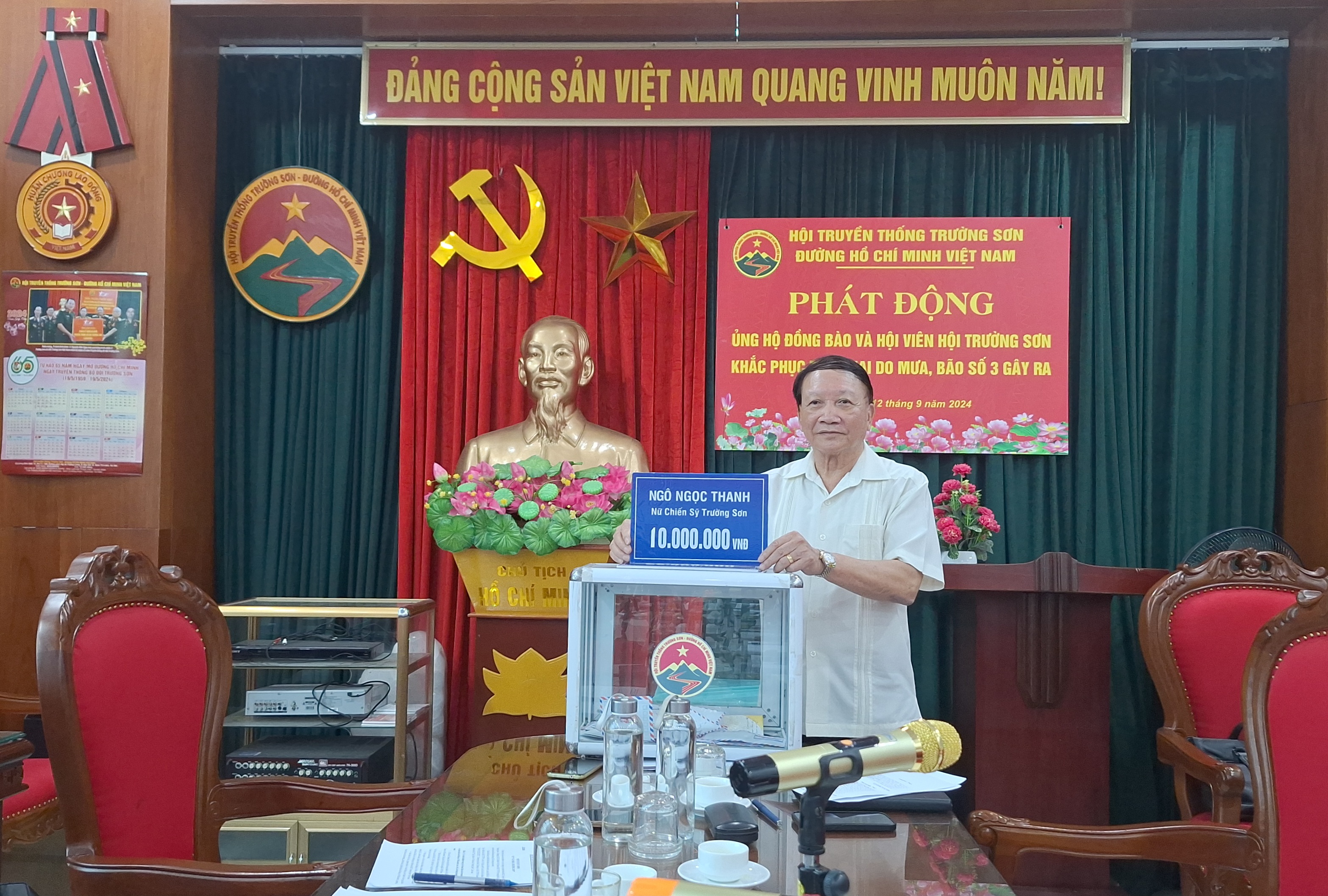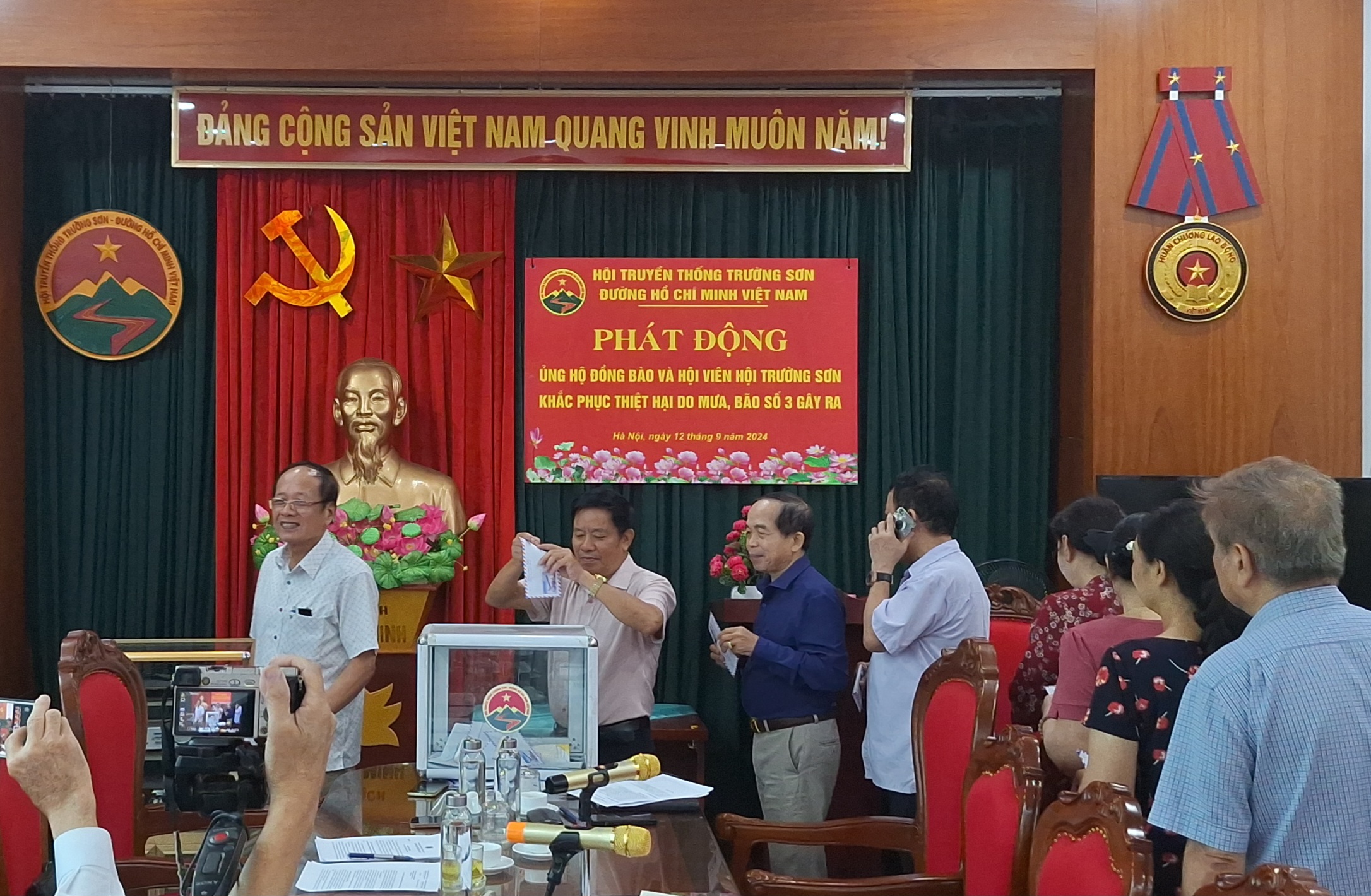 Thiếu tướng Võ Sở - Chủ tịch Hội TSVN mở đầu chương trình ủng hộ trực tiếp tiền mặt vào hòm ủng hộ của cơ quan Hội; Thiếu tướng Hoàng Anh Tuấn – Phó chủ tịch Thường trực ủng hộ tiền mặt và thay mặt các đồng chí hội viên Trường Sơn ở thành phố Hồ Chí Minh, thành phố Hà Nội và gia đình đồng chí Nguyễn Thị Minh Cử ủng hộ tiền mặt và chuyển khoản vào hòm ủng hộ. Các đồng chí Phó chủ tịch và toàn thể 40 cán bộ, nhân viên cơ quan Hội đã ủng hộ trực tiếp tiền mặt vào hòm ủng hộ. Kết quả vận động ủng hộ ở khối cơ quan sáng ngày 12/9/2024, đã thu được trên 100 triệu đồng; Thường trực Hội đã chuyển lên Ban vận động của Uỷ ban trung ương MTTQ Việt Nam đợt 1 là 100 triệu đồng, để chung tay giải quyết khó khăn với các địa phương. Phần kinh phí vật chất vận động tiếp theo sẽ chuyển đợt 2 và đợt 3.