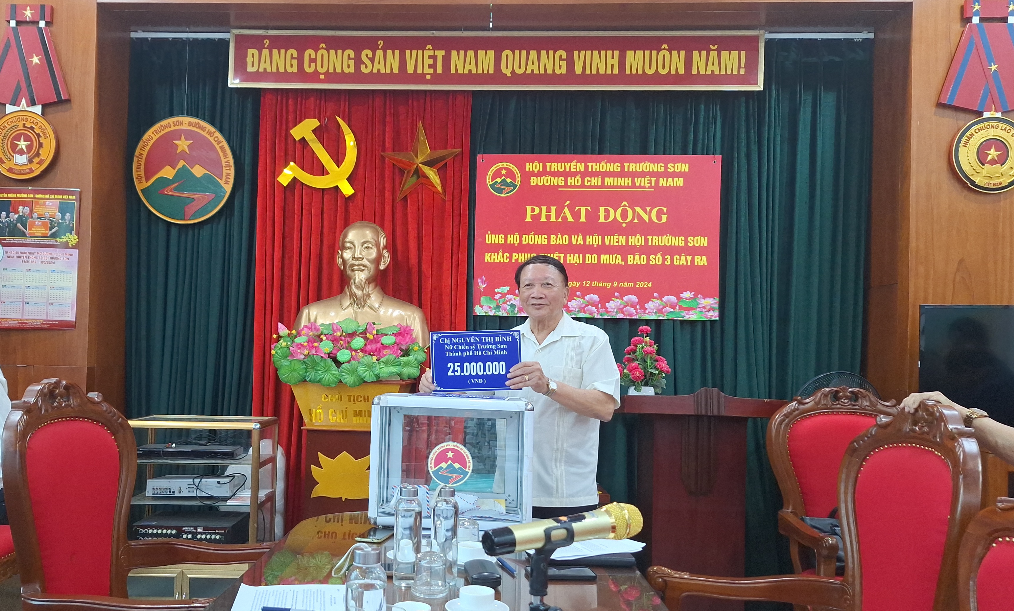 Thiếu tướng Hoàng Anh Tuấn - Phó Chủ tịch Hội Trường Sơn Việt Nam thay mặt hội viên TS Nguyễn Thị Bình - TPHCM ủng hộ 25 triệu cho nhân dân khắc phục thiệt hại do bão số 3 gây ra.