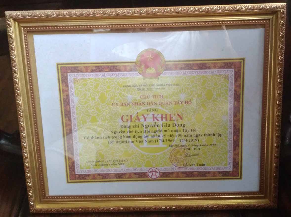 UBND quận Tây Hồ tặng Giấy khen Thương binh nặng Nguyễn Duy Đông hội viên Hội Trường Sơn phường Phú Thượng.