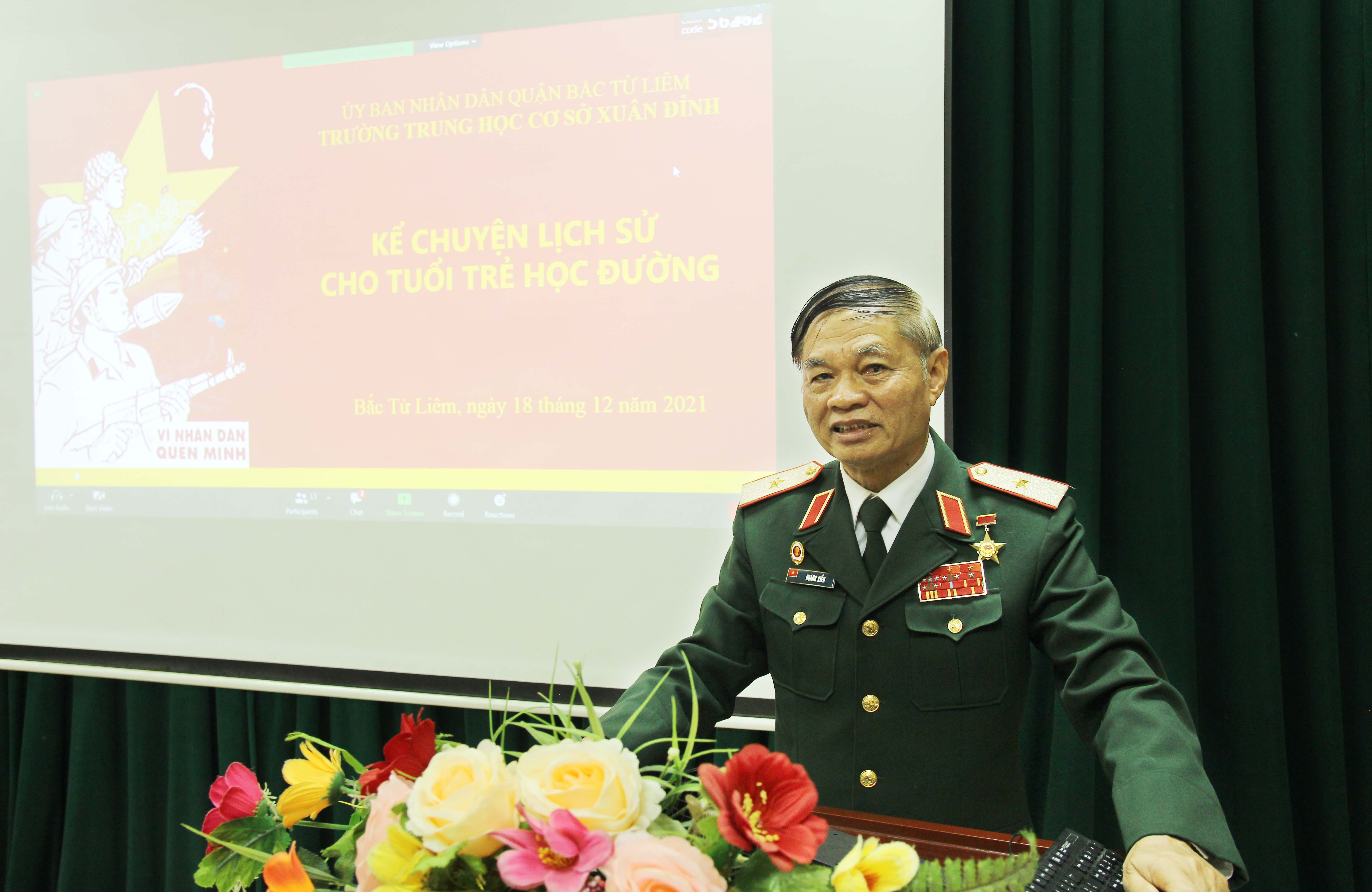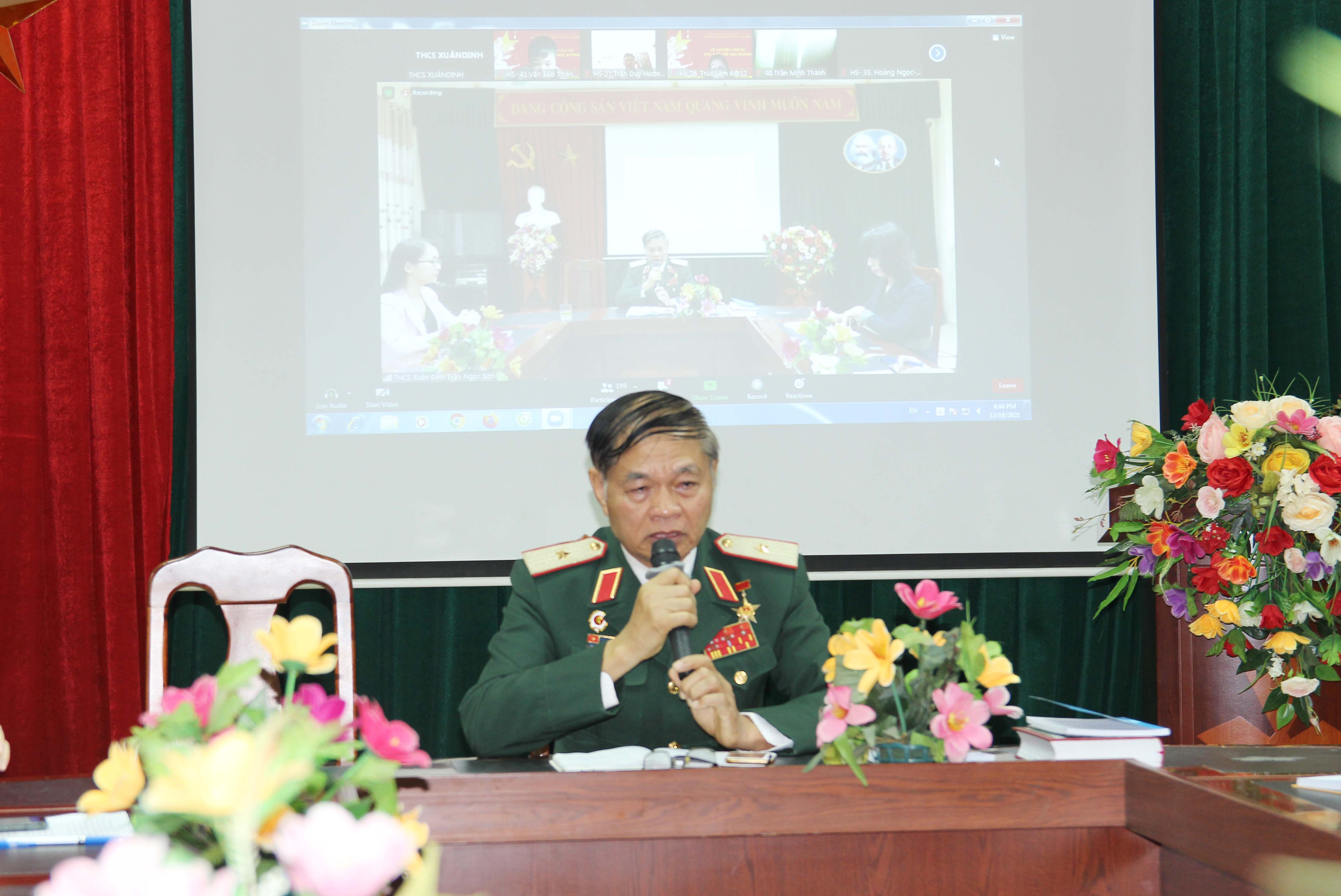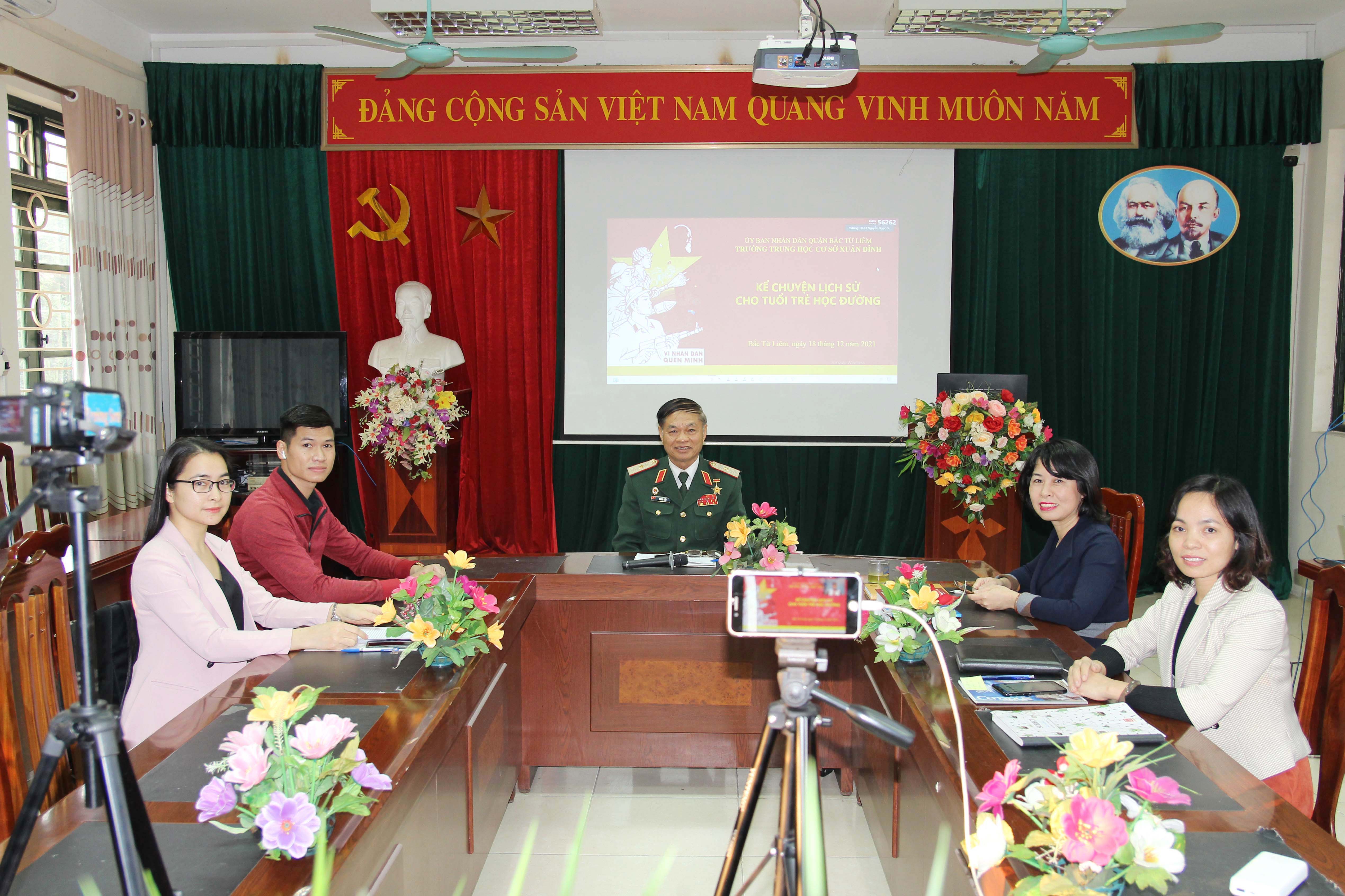 Thiếu tướng Hoàng Kiền trực tiếp kể chuyện lịch sử về truyền thống QĐNDVN anh hùng tại phòng thu buổi học trực tuyến cho học sinh trường THCS Xuân Đỉnh.