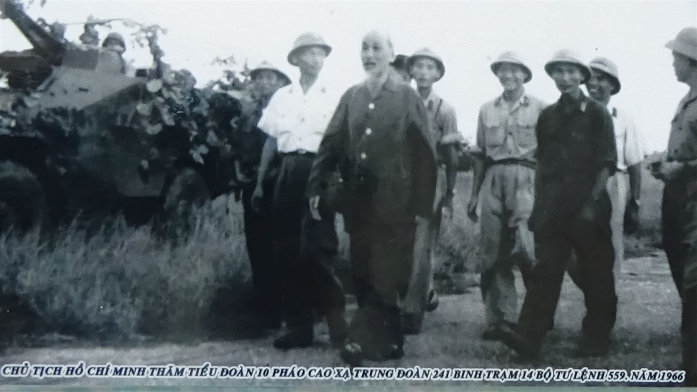 Bác Hồ về thăm trận địa pháo của Trung đoàn pháo phòng không Xung Kích - e241 năm 1966 (ảnh tư liệu).